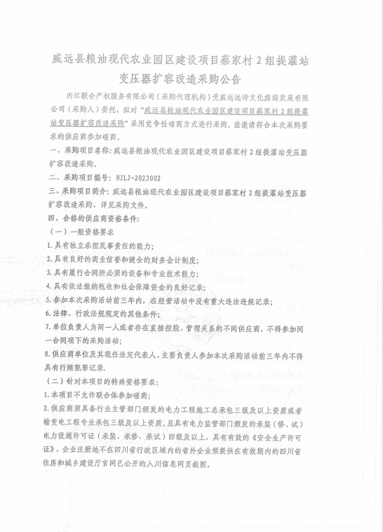 威远县粮油现代农业园区建设项目蔡家村2组提灌站变压器扩容改造采购采购公告