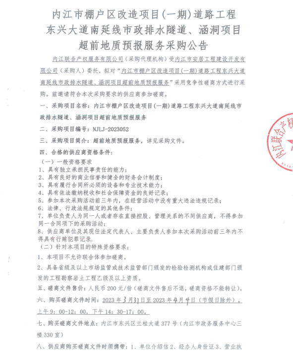 内江市棚户区改造项目(一期)道路工程东兴大道南延线市政排水隧道、涵洞项目超前地质预报服务
