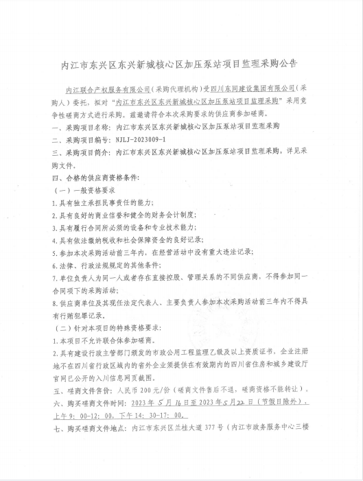 内江市东兴区东兴新城核心区加压泵站项目监理采购公告