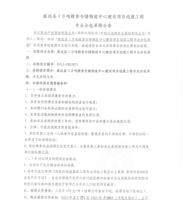 威远县3万吨粮食仓储物流中心建设项目边坡工程专业分包采购公告
