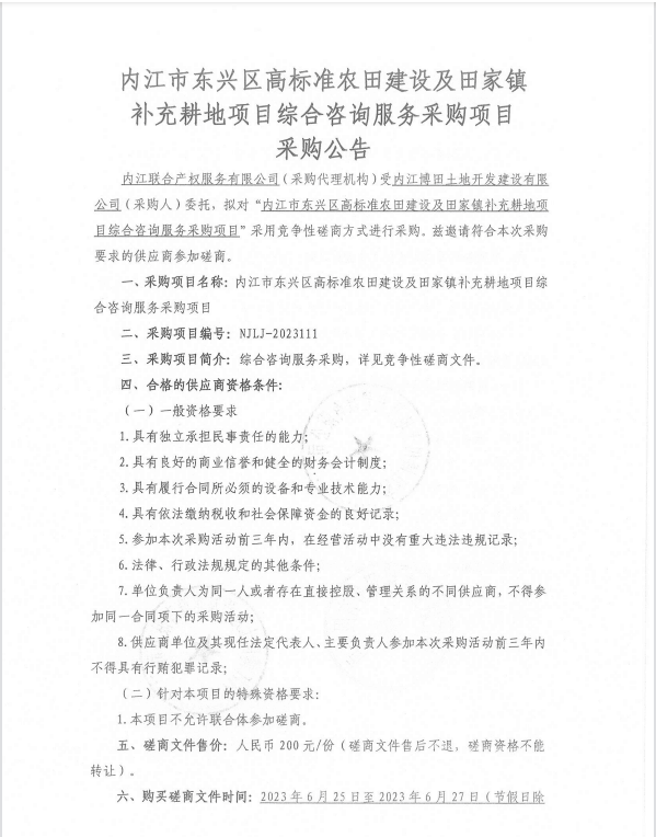 内江市东兴区高标准农田建设及田家镇补充耕地项目综合咨询服务采购项目采购公告