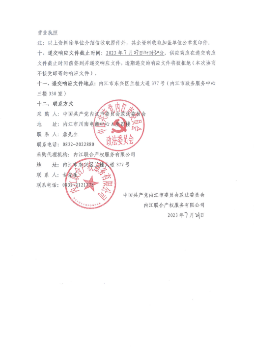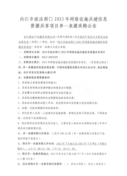 内江市政法部门2023年网络设施共建信息资源共享项目单一来源采购公告
