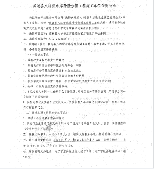 威远县八栋桥水库除险加固工程施工单位采购公告