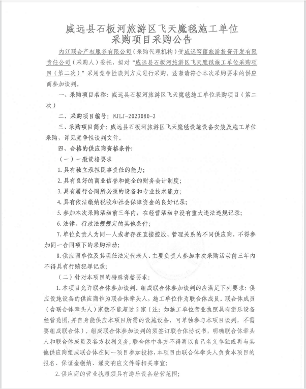 威远县石板河旅游区飞天魔毯施工单位采购项目(第二次)采购公告
