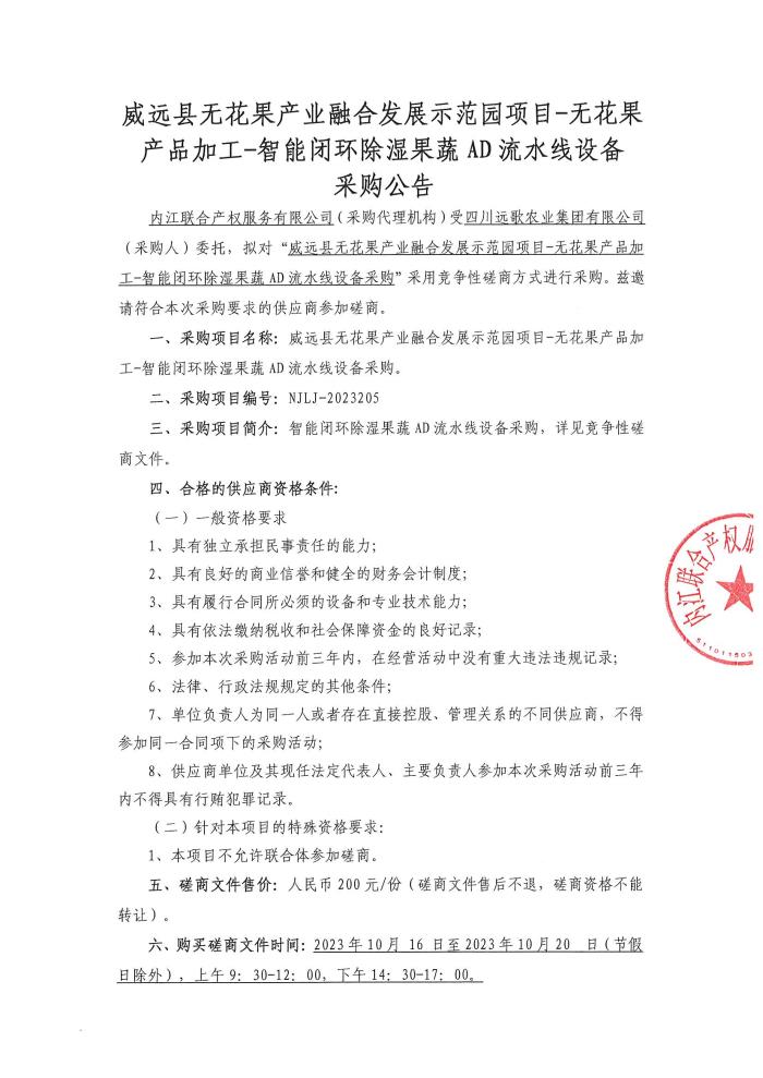 威远县无花果产业融合发展示范园项目-无花果产品加工-智能闭环除湿果蔬AD流水线设备采购公告