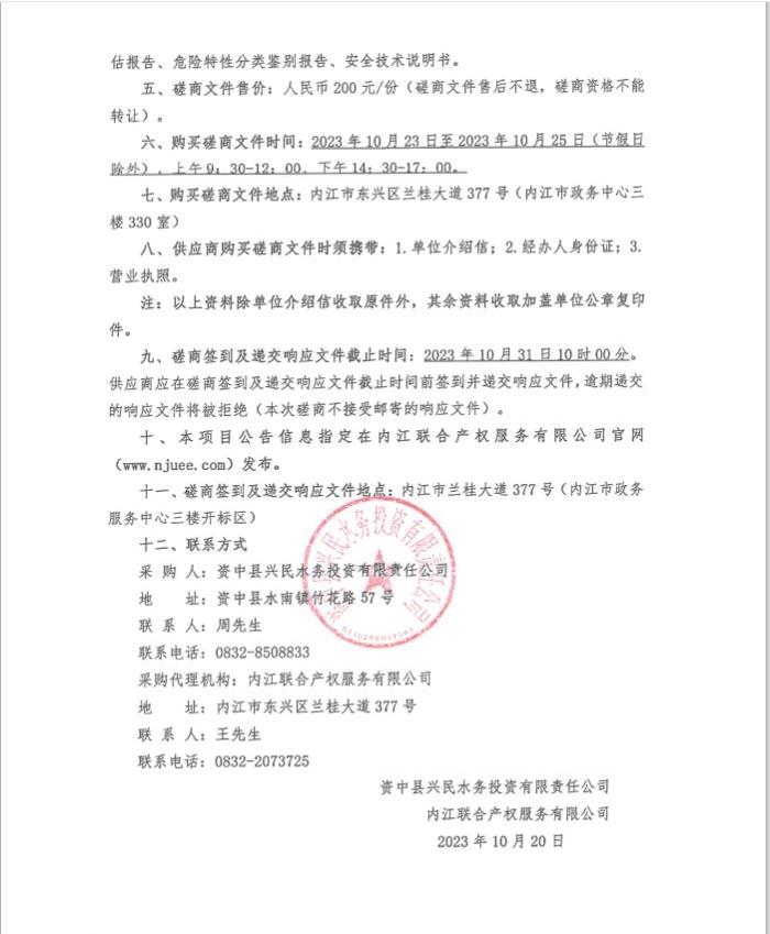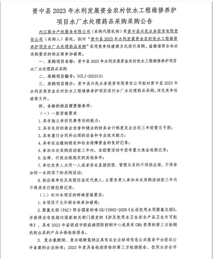 资中县2023年水利发展资金农村饮水工程维修养护项目水厂水处理药品采购采购公告