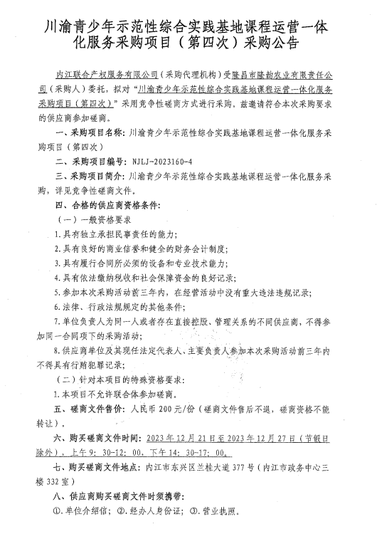 川渝青少年示范性综合实践基地课程运营一体化服务采购项目(第四次)采购公告