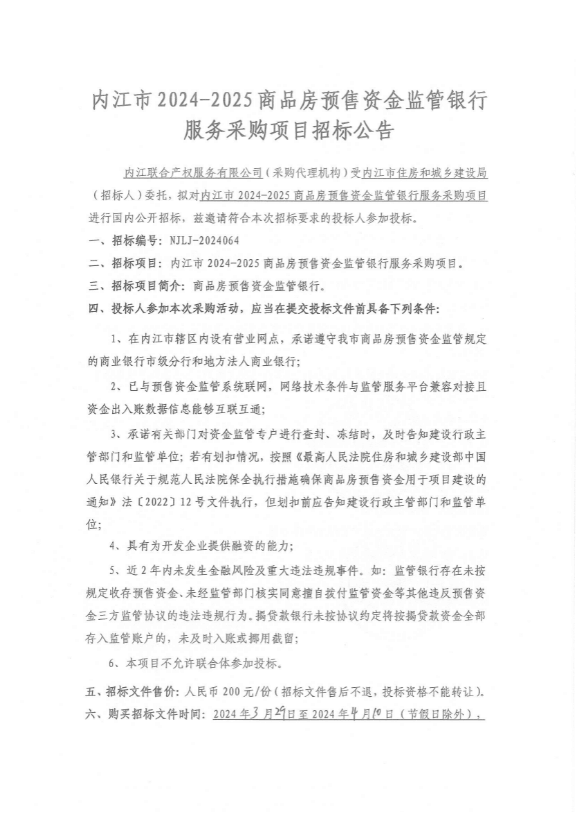 内江市2024-2025商品房预售资金监管银行服务采购项目采购公告