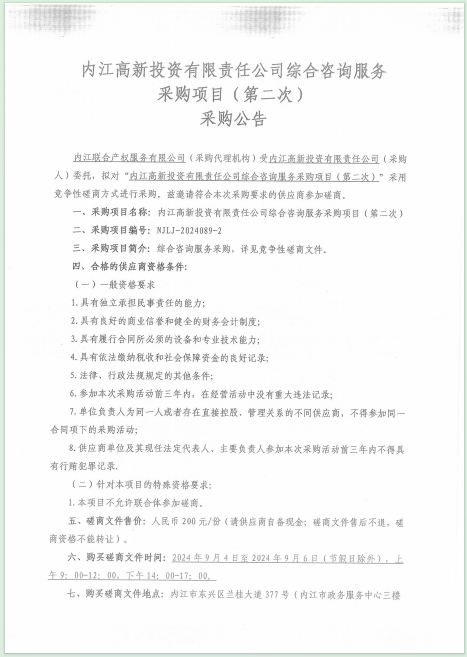 内江高新投资有限责任公司综合咨询服务采购项目(第二次)采购公告