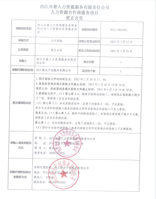 内江兴睿人力资源服务有限责任公司人力资源合作商服务项目更正公告