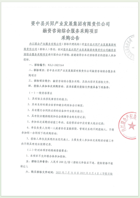 资中县兴昇产业发展集团有限责任公司融资咨询综合服务采购项目采购公告