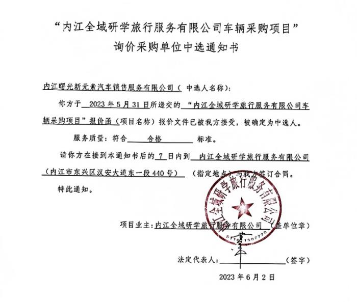 “内江全域研学旅行服务有限公司车辆采购项目”询价采购单位中选通知书