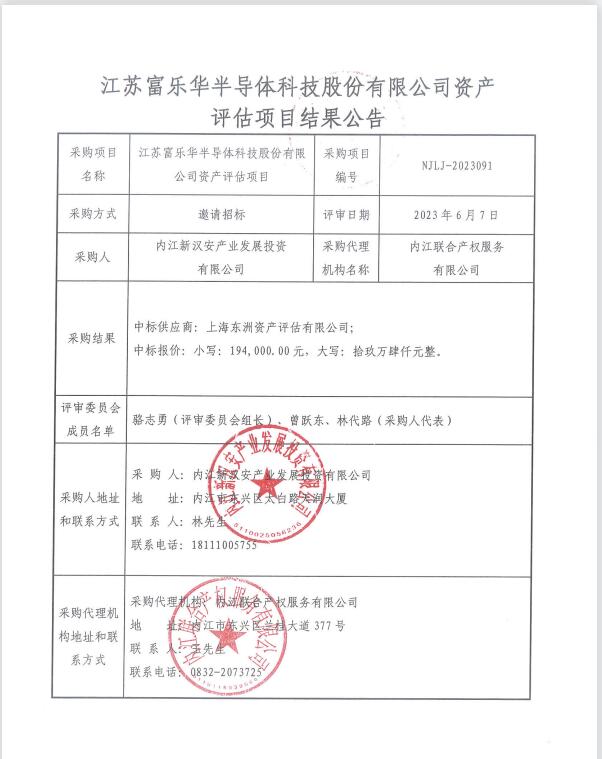 江苏富乐华半导体科技股份有限公司资产评估项目结果公告
