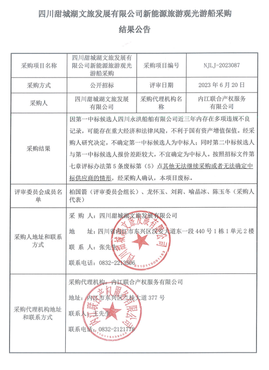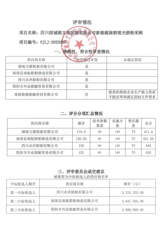 四川甜城湖文旅发展有限公司新能源旅游观光游船采购