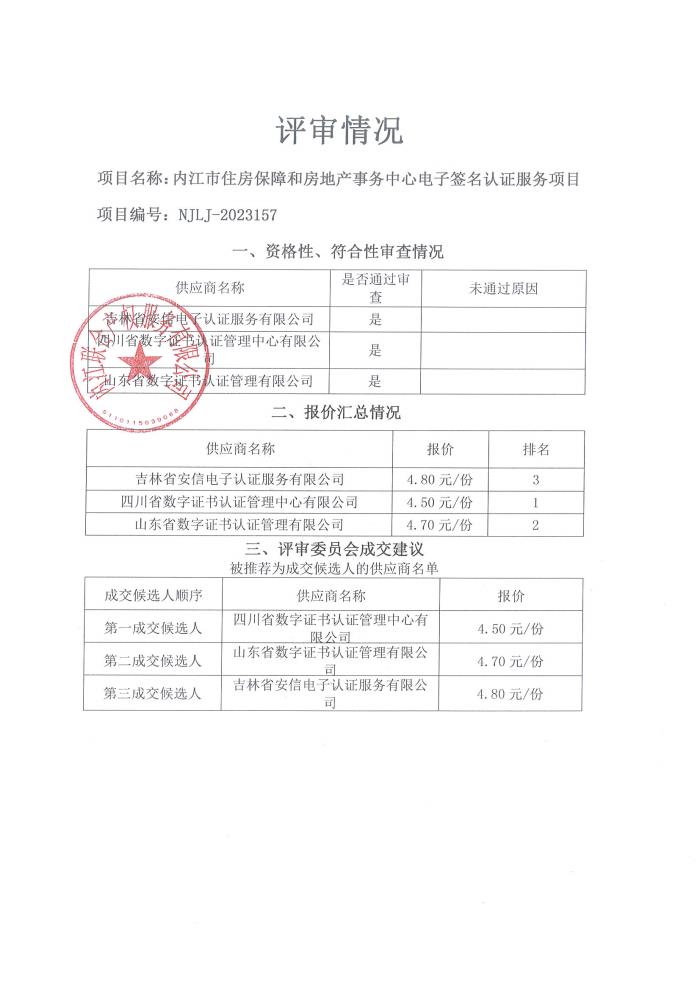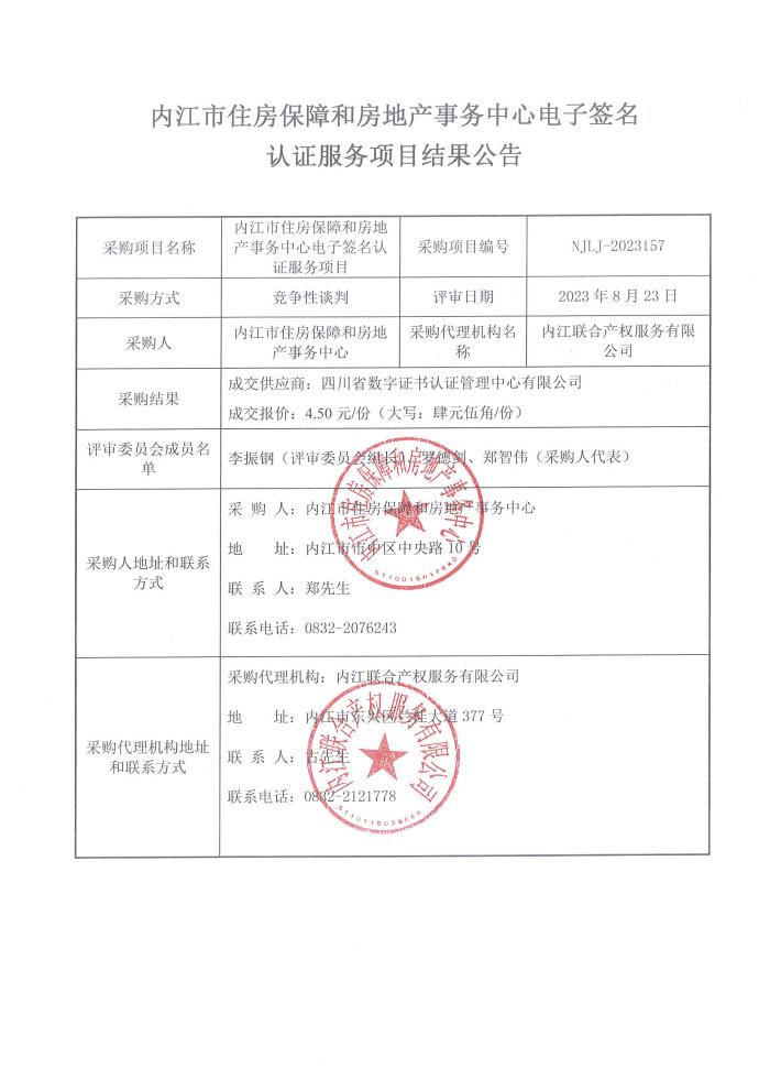 内江市住房保障和房地产事务中心电子签名认证服务项目结果公告