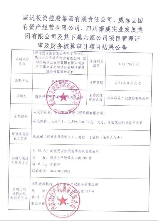 威远投资控股集团有限责任公司、威远县国有资产经营有限公司、四川振威实业发展集团有限公司及其下属六家公司项目管理评审及财务核算审计项目结果公告