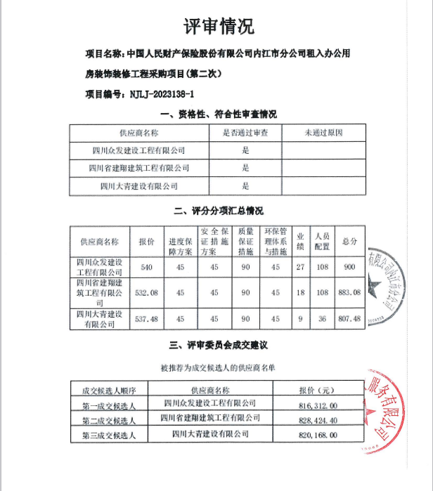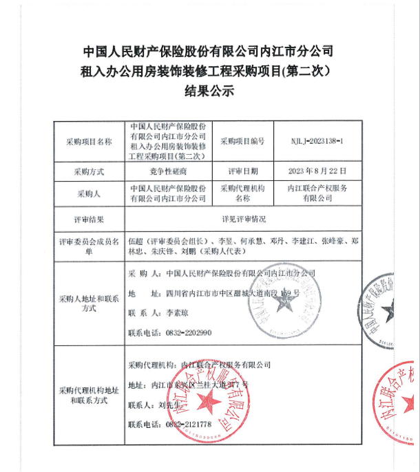 中国人民财产保险股份有限公司内江市分公司租入办公用房装饰装修工程采购项目(第二次)结果公示