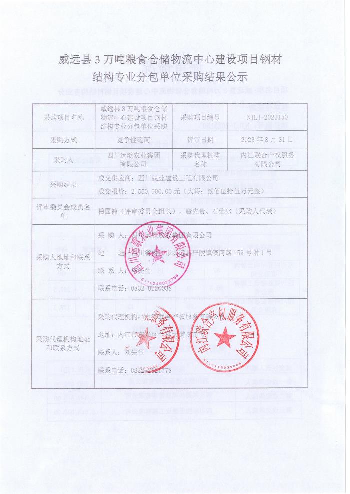 威远县3万吨粮食仓储物流中心建设项目钢材结构专业分包单位采购结果公示