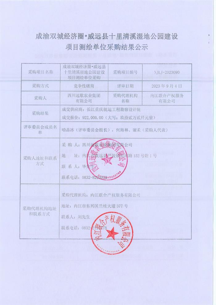成渝双城经济圈•威远县十里清溪湿地公园建设项目测绘单位采购结果公示