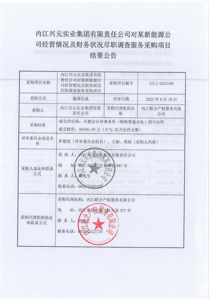 内江兴元实业集团有限责任公司对某新能源公司经营情况及财务状况尽职调查服务采购项目结果公告
