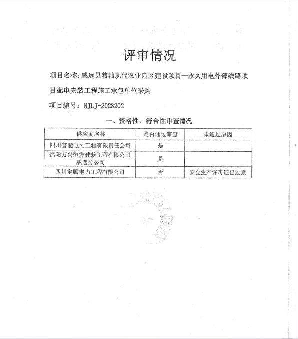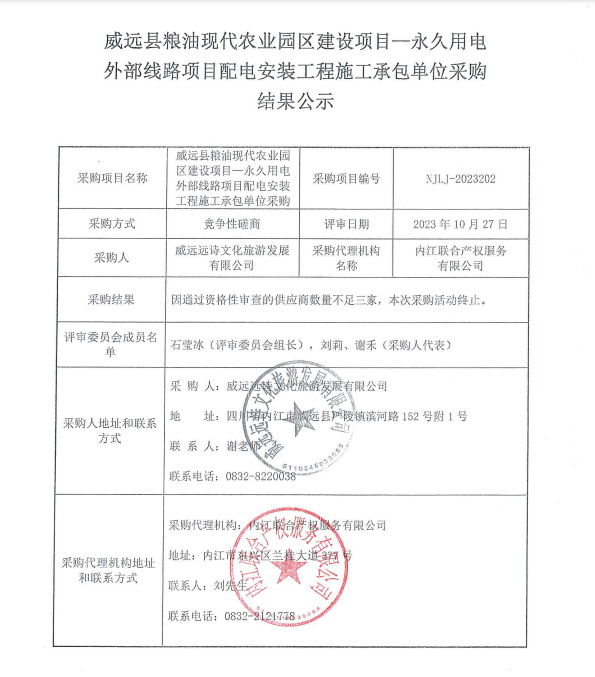 威远县粮油现代农业园区建设项目—永久用电外部线路项目配电安装工程施工承包单位采购结果公示