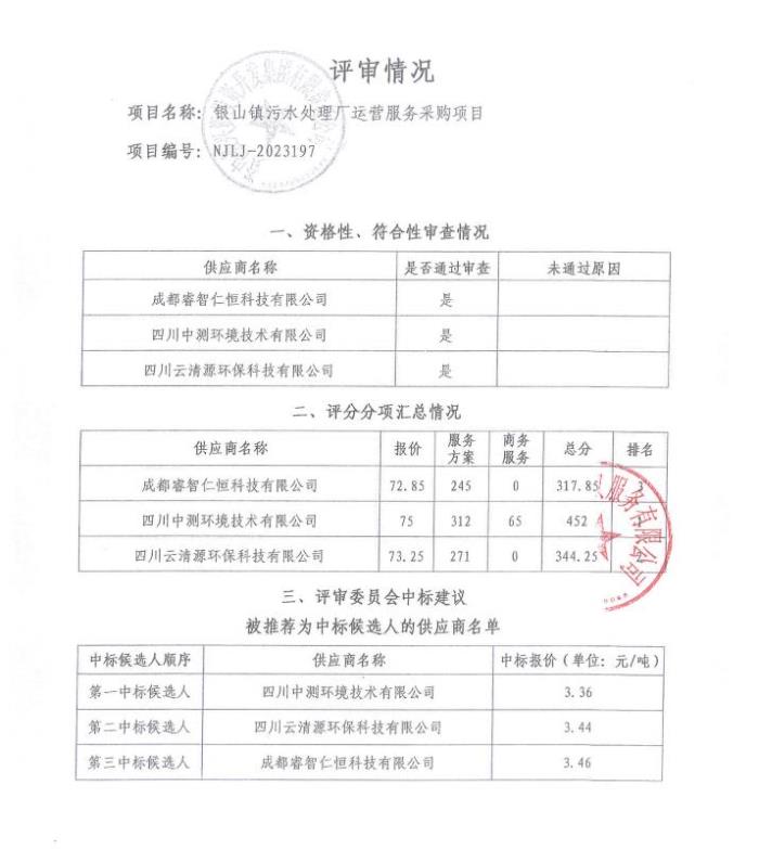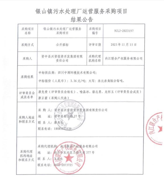 银山镇污水处理厂运营服务采购项目结果公告