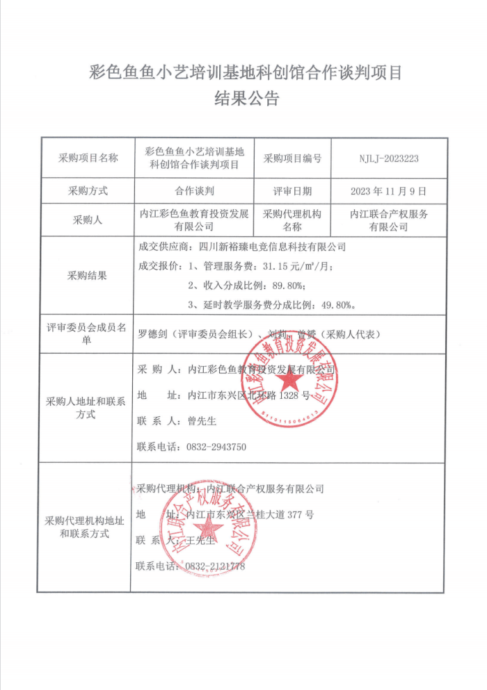 彩色鱼鱼小艺培训基地科创馆合作谈判项目结果公告