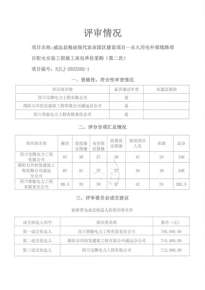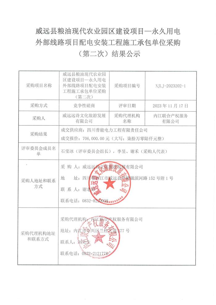 威远县粮油现代农业园区建设项目—永久用电外部线路项目配电安装工程施工承包单位采购(第二次)结果公示