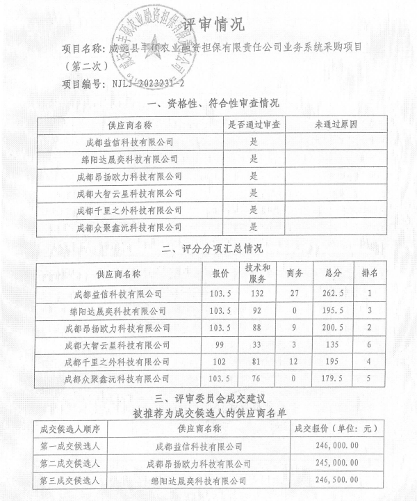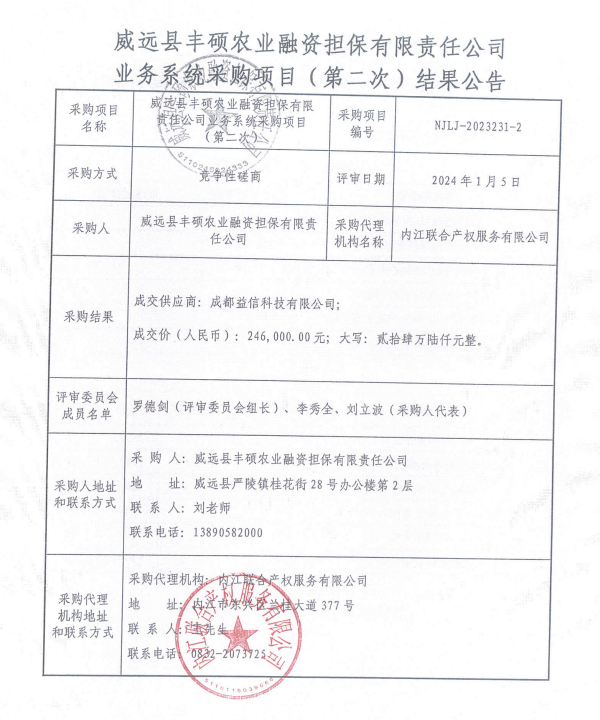 威远县丰硕农业融资担保有限责任公司业务系统采购项目(第二次)结果公告