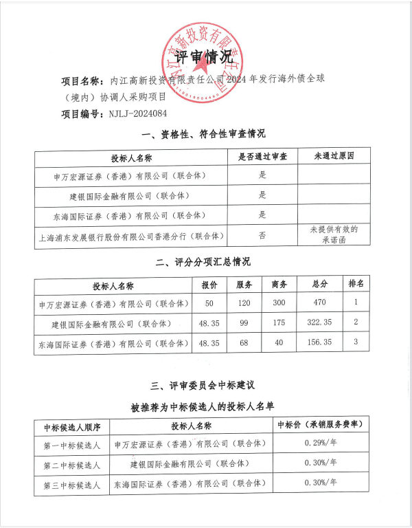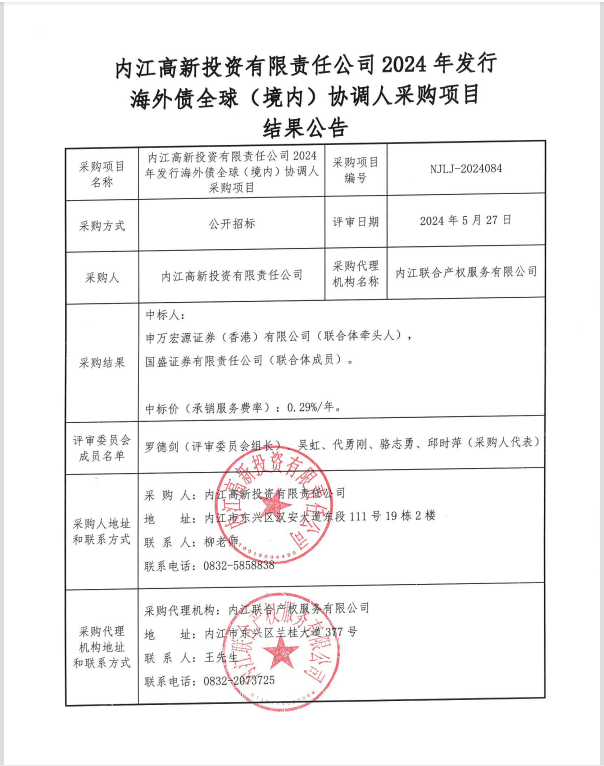 内江高新投资有限责任公司2024年发行海外债全球(境内)协调人采购项目结果公告
