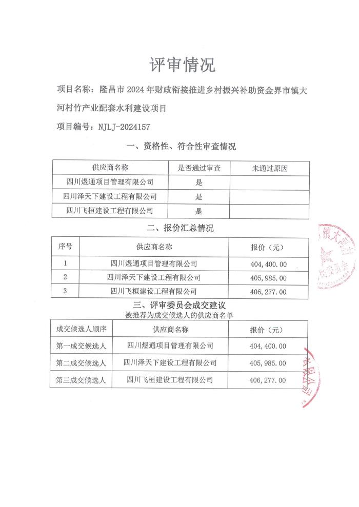 隆昌市2024年财政衔接推进乡村振兴补助资金界市镇大河村竹产业配套水利建设项目结果公告