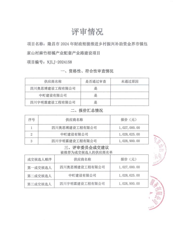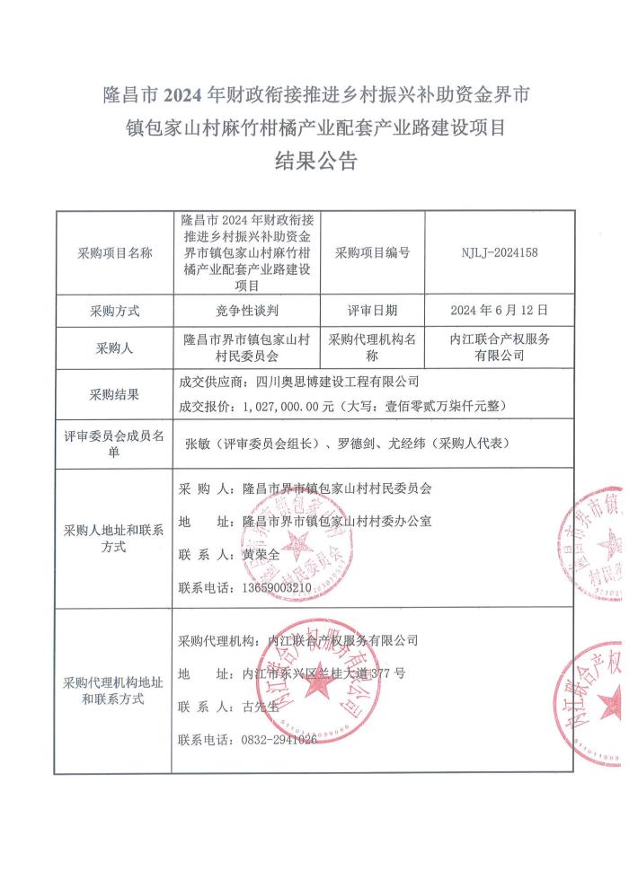 隆昌市2024年财政衔接推进乡村振兴补助资金界市镇包家山村麻竹柑橘产业配套产业路建设项目结果公告