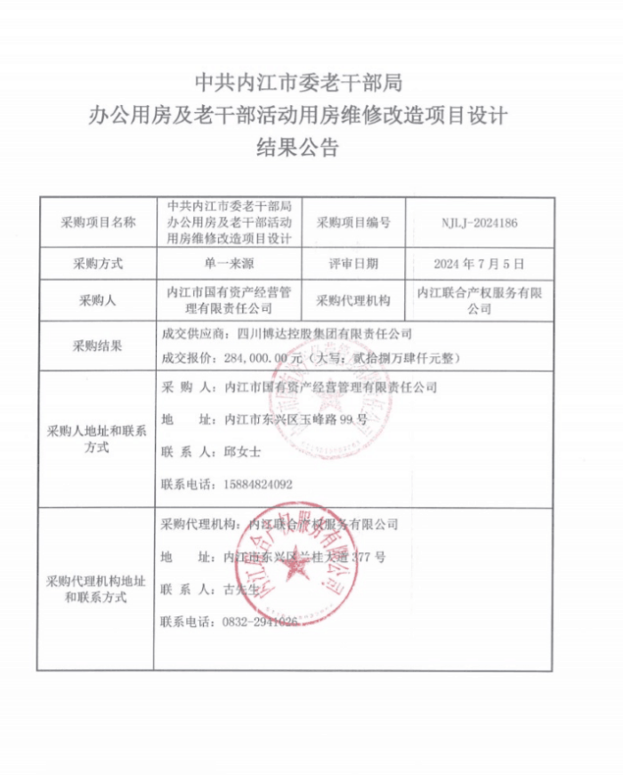 中共内江市委老干部局办公用房及老干部活动用房维修改造项目设计结果公告