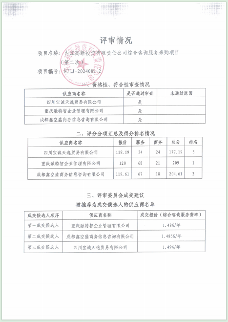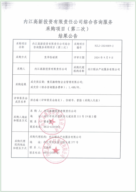 内江高新投资有限责任公司综合咨询服务采购项目(第二次)结果公告