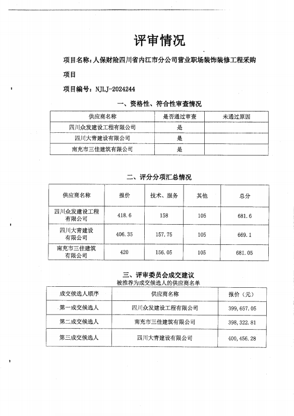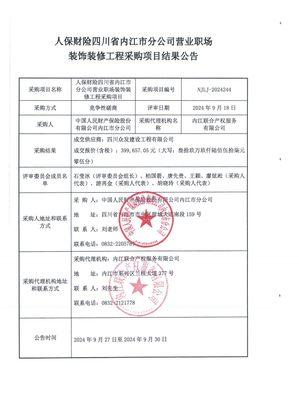 人保财险四川省内江市分公司营业职场装饰装修工程采购项目结果公告