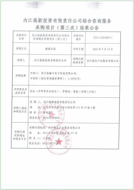 内江高新投资有限责任公司综合咨询服务采购项目(第三次)结果公告