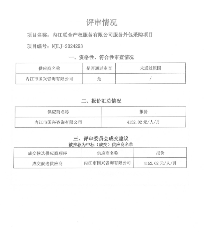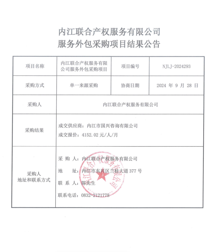 内江联合产权服务有限公司服务外包采购项目结果公告