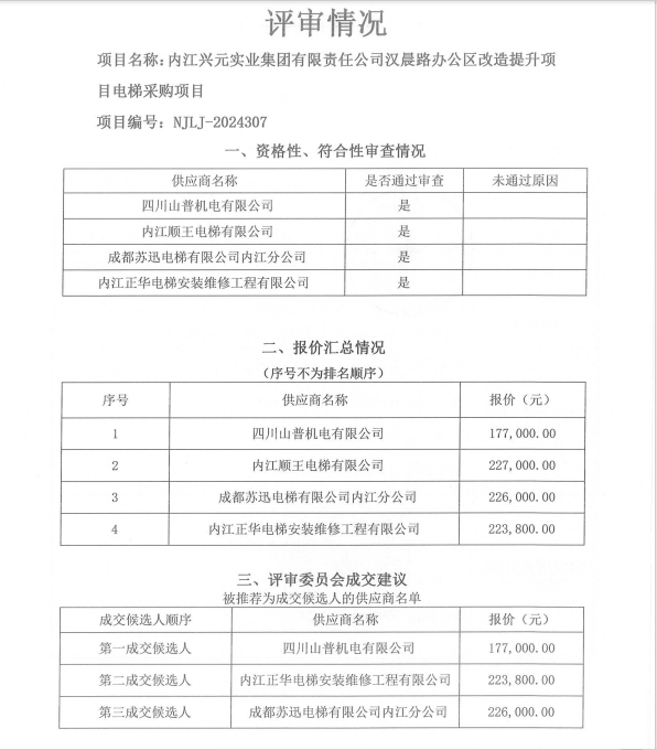 内江兴元实业集团有限责任公司汉晨路办公区改造提升项目电梯采购项目结果公告