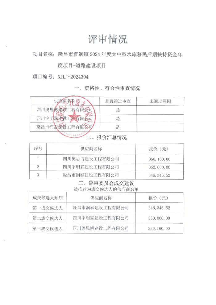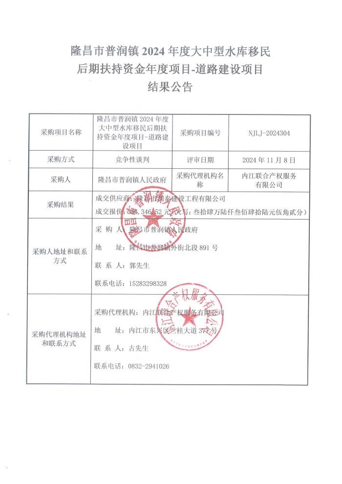 隆昌市普润镇2024年度大中型水库移民后期扶持资金年度项目-道路建设项目结果公告