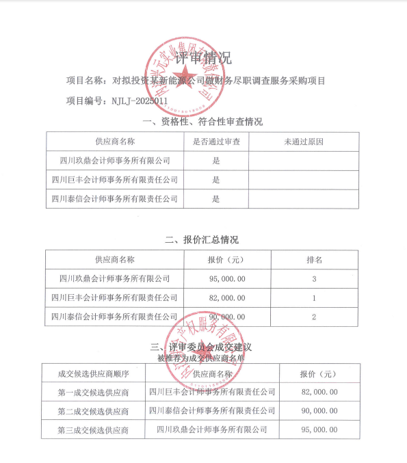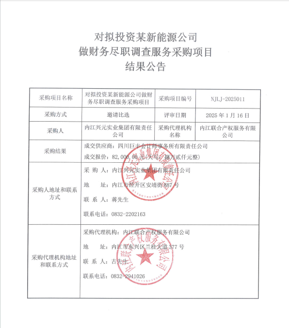 对拟投资某新能源公司做财务尽职调查服务采购项目结果公告