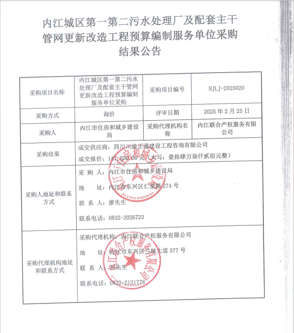 内江城区第一第二污水处理厂及配套主干管网更新改造工程预算编制服务单位采购结果公告