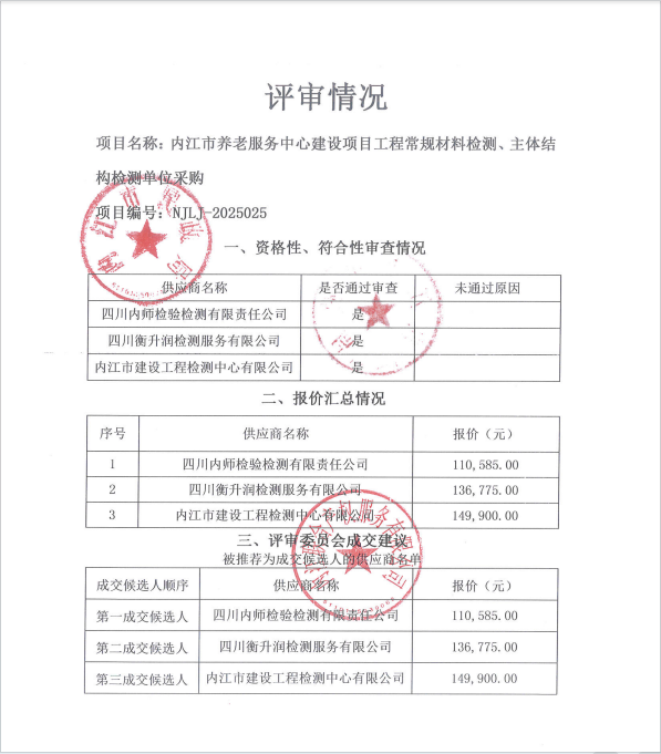内江市养老服务中心建设项目工程 常规材料检测、主体结构检测单位采购结果公告