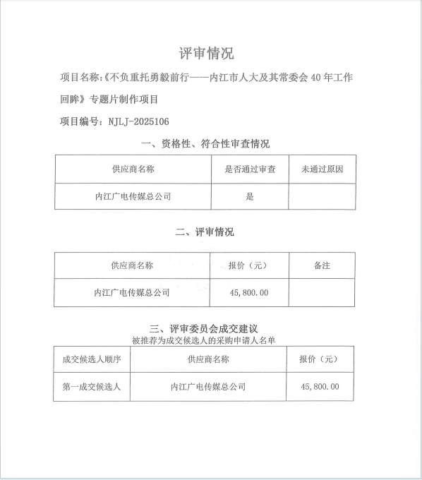 《不负重托勇毅前行——内江市人大及其常委会40年工作回眸》专题片制作项目结果公告