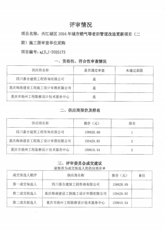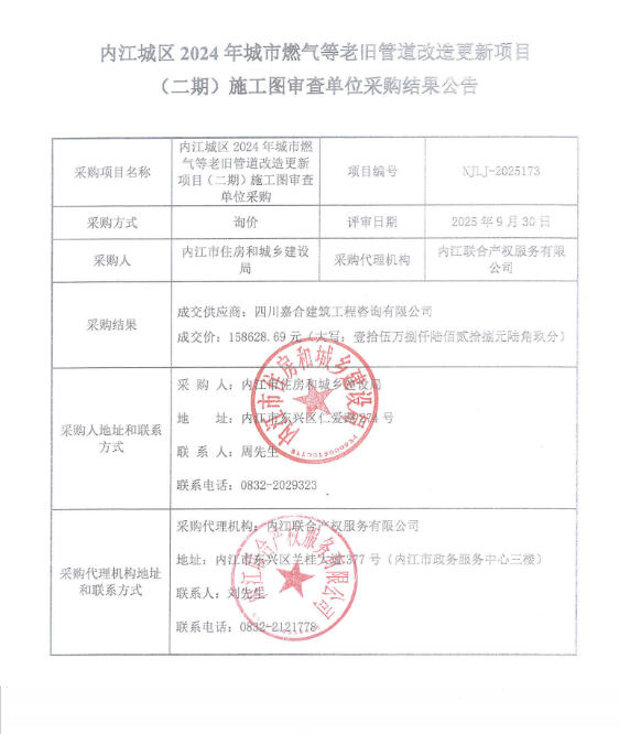 内江城区2024年城市燃气等老旧管道改造更新项目(二期)施工图审查单位采购结果公告
