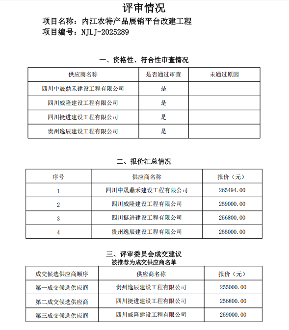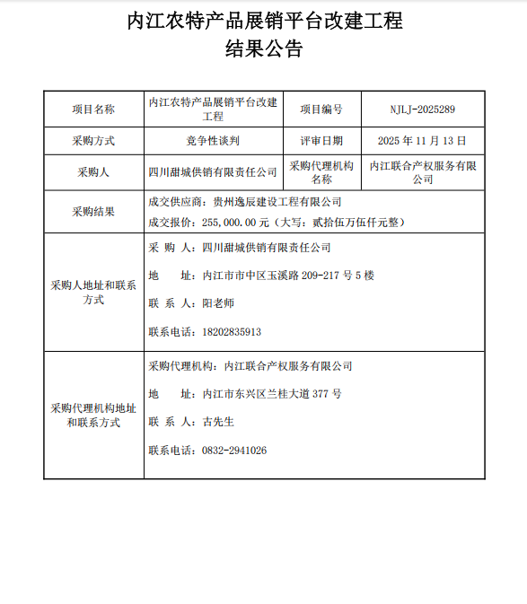 内江农特产品展销平台改建工程结果公告