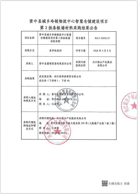 资中县城乡冷链物流中心智慧仓储建设项目第2批条板墙材料采购结果公告